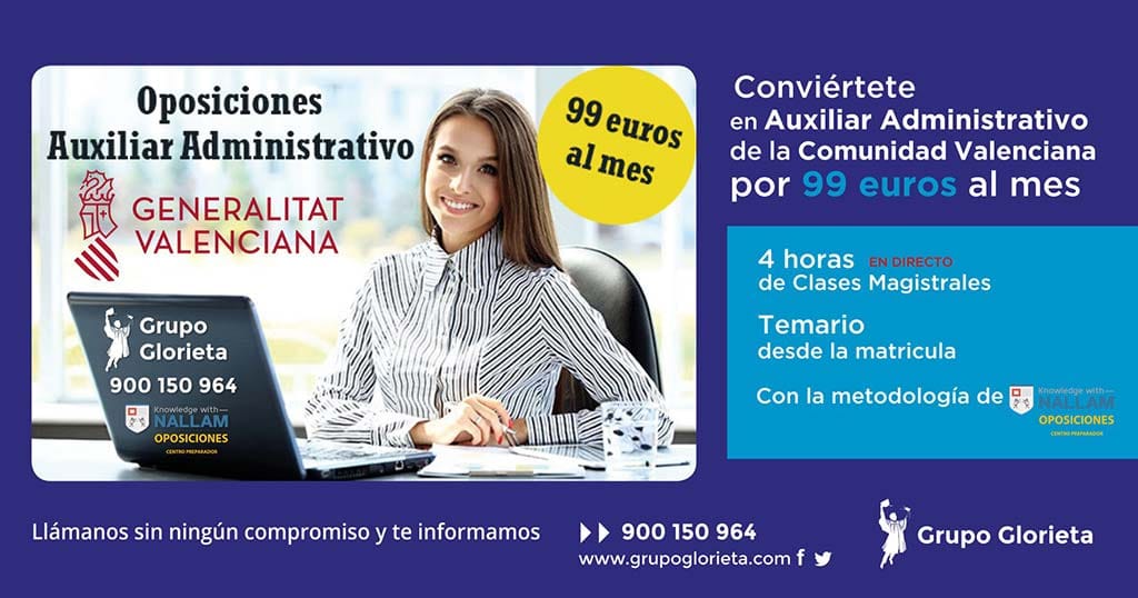 Academia La Glorieta cuenta con el mejor curso de para que te formes como Auxiliar Administrativo de la Comunidad Valenciana. Disfruta de este fantástico curso, por tan solo 99€ al mes.