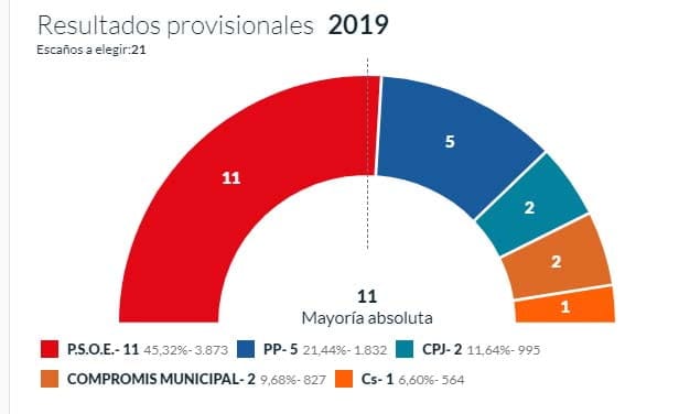 La encuesta pronosticaba la revalidación de mayoría absoluta del PSOE, y así ha sido. La encuesta le otorgaba la victoria con 12 concejales, y finalmente han sido 11, los que entrarán a formar parte de la corporación municipal, siendo así mayoría absoluta.