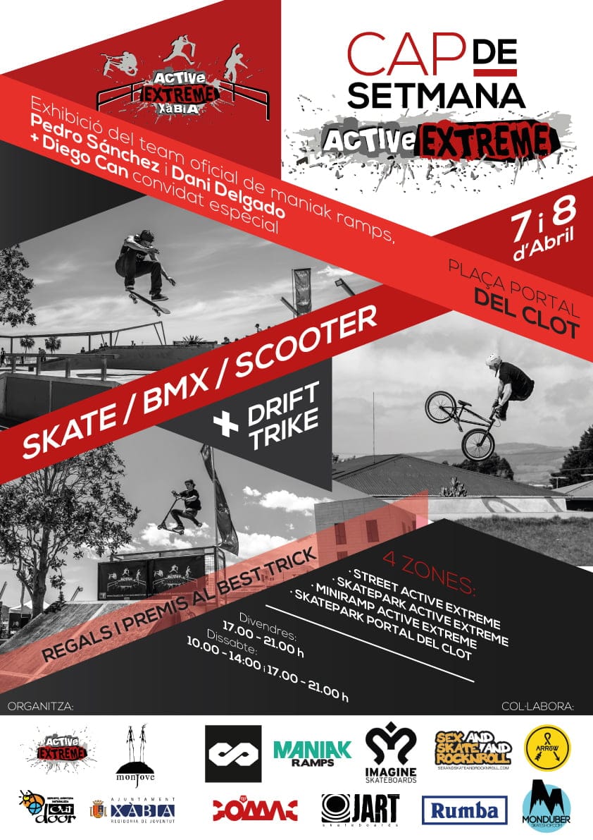 Los jóvenes de Xàbia disfrutarán de un fin de semana lleno de deporte urbano con el Active Extreme. Monjove estrena, este mes de abril, una nueva iniciativa en la que se reúne una competición de skate y exhibiciones de esta modalidad y otros deportes urbanos como la BMXo scooter.