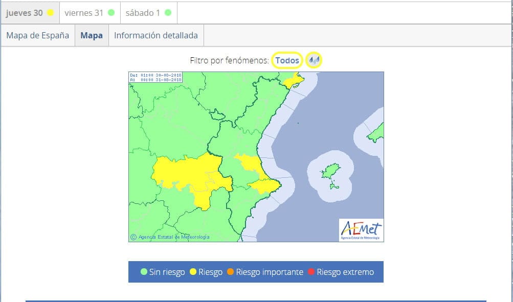 Entre las 6 de la mañana y las 18 horas, hay una probabilidad del 90% de que se produzcan tormentas leves en Xàbia y comarca. La Agencia Estatal de Meteorología ha alertado de que en el litoral norte de Alicante (haciendo referencia a la Marina Alta) se activa, para este jueves 30 de agosto, el riesgo amarillo por lluvias ya que podrían alcanzar los 30 litros por m2 en una hora.