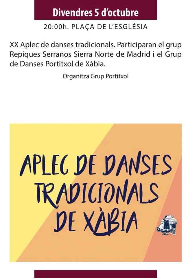 La programación con motivo del 9 de octubre continua este viernes 5 de octubre con el XX Aplec de Danses Tradicionals de Xàbia. Un encuentro que tendrá lugar a partir de las 20 horas en la plaza de la iglesia y reunirá a cientos de ballaors. Participarán el Grup Repiques Serranos Sierra Norte de Madrid y el Grup de Danses Portitxol de Xàbia, que además es el organizador de este evento.
