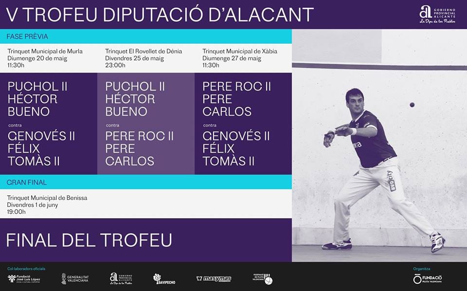 Xàbia acoge, el domingo 27 de mayo, a las 11:30 horas, el V Trofeu de la Diputació de Pilota. Será en el Trinquet Municipal. Una partida en la que se enfrentarán Pere Roc II, Pere y Carlos contra Genovés II, Félix y Tomás II.