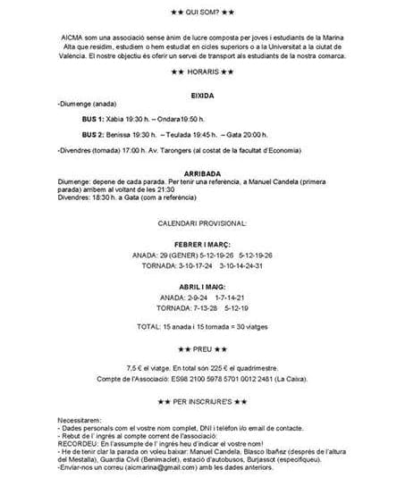 La Asociación AICMA, formada por jóvenes estudiantes de la Marina Alta, trabaja para que el transporte semanal de los universitarios sea más fácil. Los estudiantes de la comarca que realizan sus estudios en Valencia y busquen una manera más fácil y directa de trasladarse cada semana, ha de ponerse en contacto con AICMA.