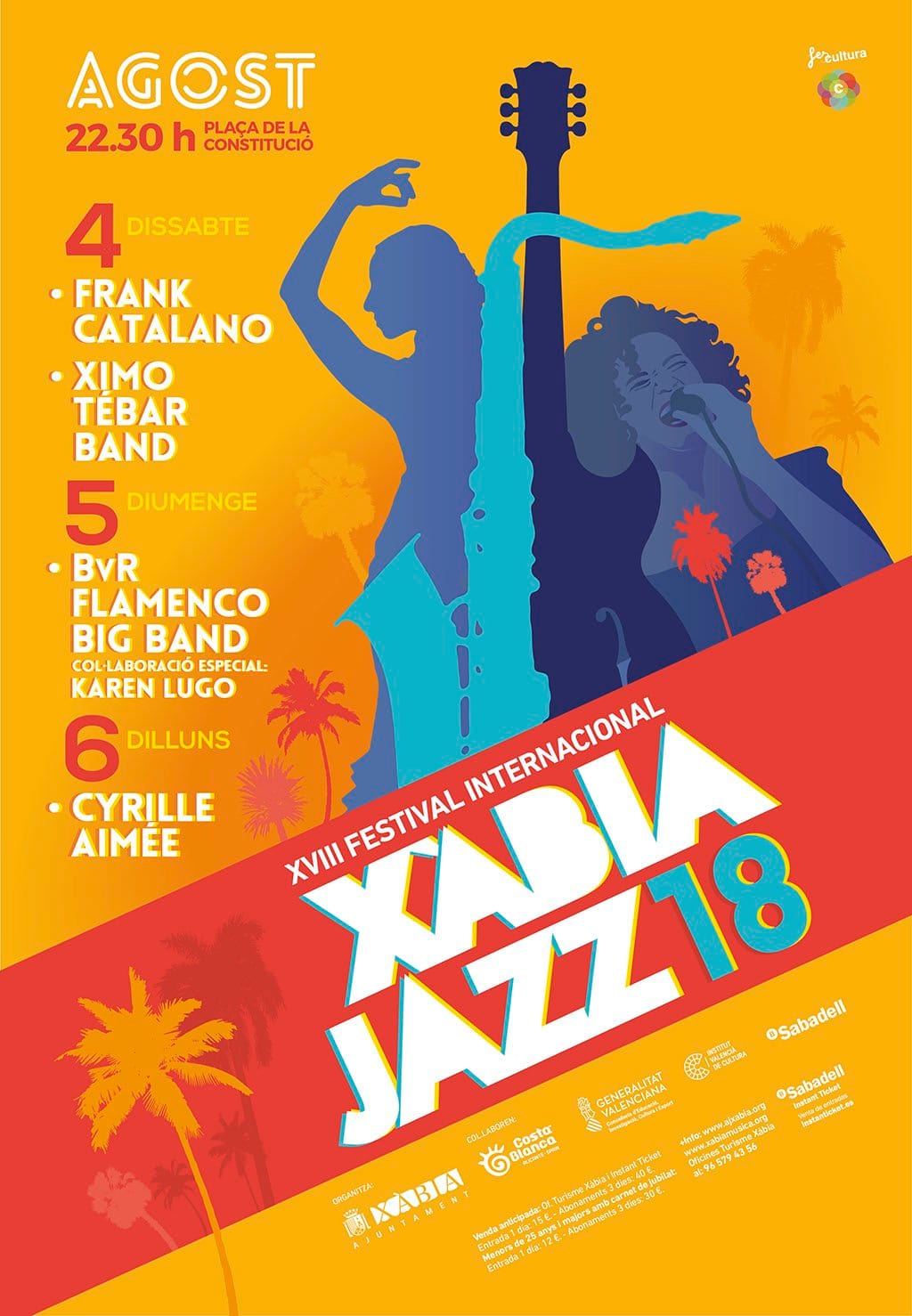 Frank Catalano, Ximo Tébar Band, la BVR Flamenco Big Band con la colaboración de la bailadora Karen Lugo y la cantante Cyrille Aimeé serán los artistas que protagonizarán la décimo octava edición del Xàbia Jazz 2018 del 4 al 6 de agosto en la Plaza de la Constitución, a las 22:30 horas.