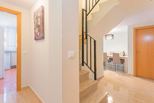 En la planta baja encontramos el salón/comedor y la cocina independiente. Ademas hay un aseo de invitados. Mientras que en la planta de arriba existen dos dormitorios, un cuarto de baño y dos terrazas.
