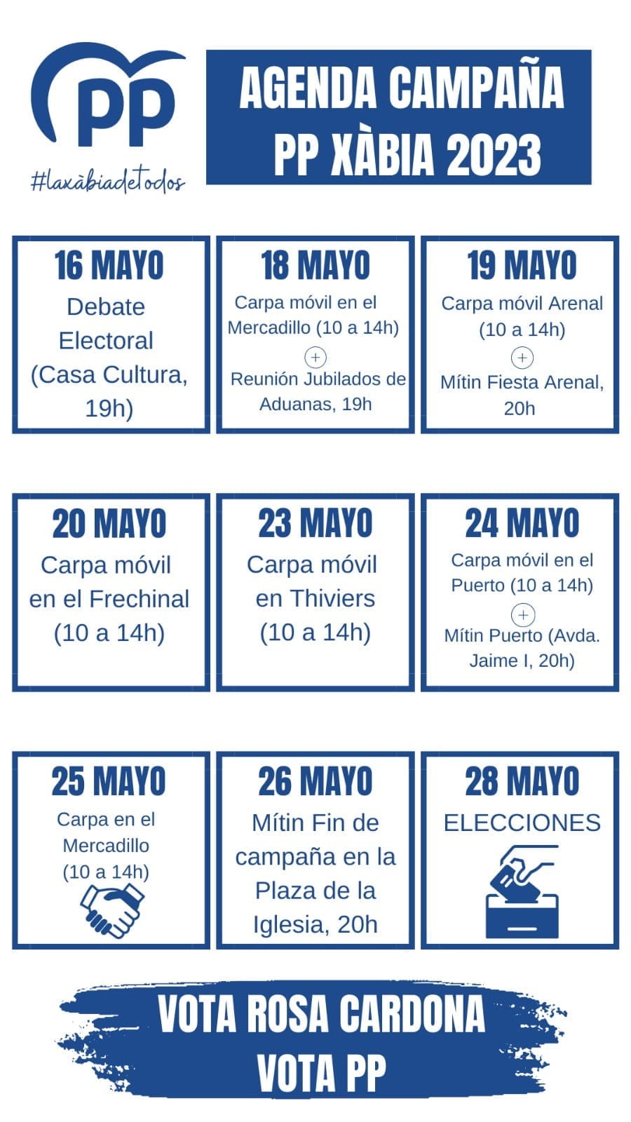 17 de mayo de 2023 - 13:44 Foto Anterior2 de 10Foto SiguienteVer el artículo original: Calendario de las elecciones locales Xàbia 2023: fechas y horas de los mítines, actos y encuentros de los partidos políticos Actos PSOE Xàbia Campaña Electoral 2023 Calendario actos campaña electoral PP Xàbia 2023 Actos de Podem Xàbia Candidatura de Ciudadanos por Jávea – Elecciones 2023 Equipo de Compromís per Xàbia-Elecciones 2023 Candidatos a la alcaldía de Xàbia- Elecciones 2023 Calendario electoral de Ciudadanos por Jávea (CpJ) Mitin de VOX Jávea Mitin VOX Jávea Nuevos horarios de mitin del PP