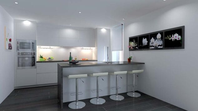 La villa dispondrá de un salón-comedor con más de 40m2, una cocina de alta gama y tres dormitorios, todos con baño en suite y vestidor. La cocina moderna, de gama alta, y con electrodomésticos de la última generación, será instalada por Dimode Gandia, distribuidor oficial de COCINAS SANTOS, empresa que garantiza la mejor calidad en diseño y funcionamiento.