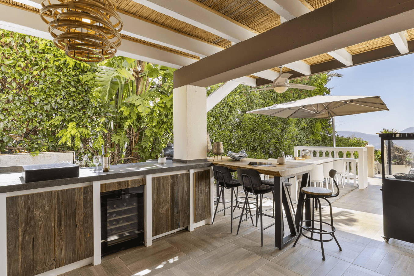 26 de mayo de 2022 - 11:02Cocina exterior totalmente equipada de estilo industrial Foto Anterior7 de 20Foto SiguienteVer el artículo original: Casa Feliz: la villa vacacional de diseño en Jávea que parece sacada de una película Baño con dos labavos y paredes de piedra Baño de la vivienda con ducha Baño equipado con plato de ducha Casa Feliz con piscina infinity Casa Feliz en Jávea Cocina exterior cubierta con diseño industrial Cocina exterior cubierta, de estilo industrial Cocina interior junto a la cocina exterior, con isla en el centro Dormitorio con balcón y cama doble Dormitorio de estilo étnico y cama doble Dormitorio de estilo rústico con cama de matrimonio Hall de entrada con acceso a la planta superior Hall en la planta superior con acceso a la terraza Piscina infinita con zona de tumbonas Salón de la vivienda con gran sofá y chimenea Terraza con zona chill out con sombrilla Terraza cubierta con zona relax Terraza exterior con un original mueble de madera Zona de comedor junto al salón Zona de salón con acceso a la terraza cubierta y un gran sofá
