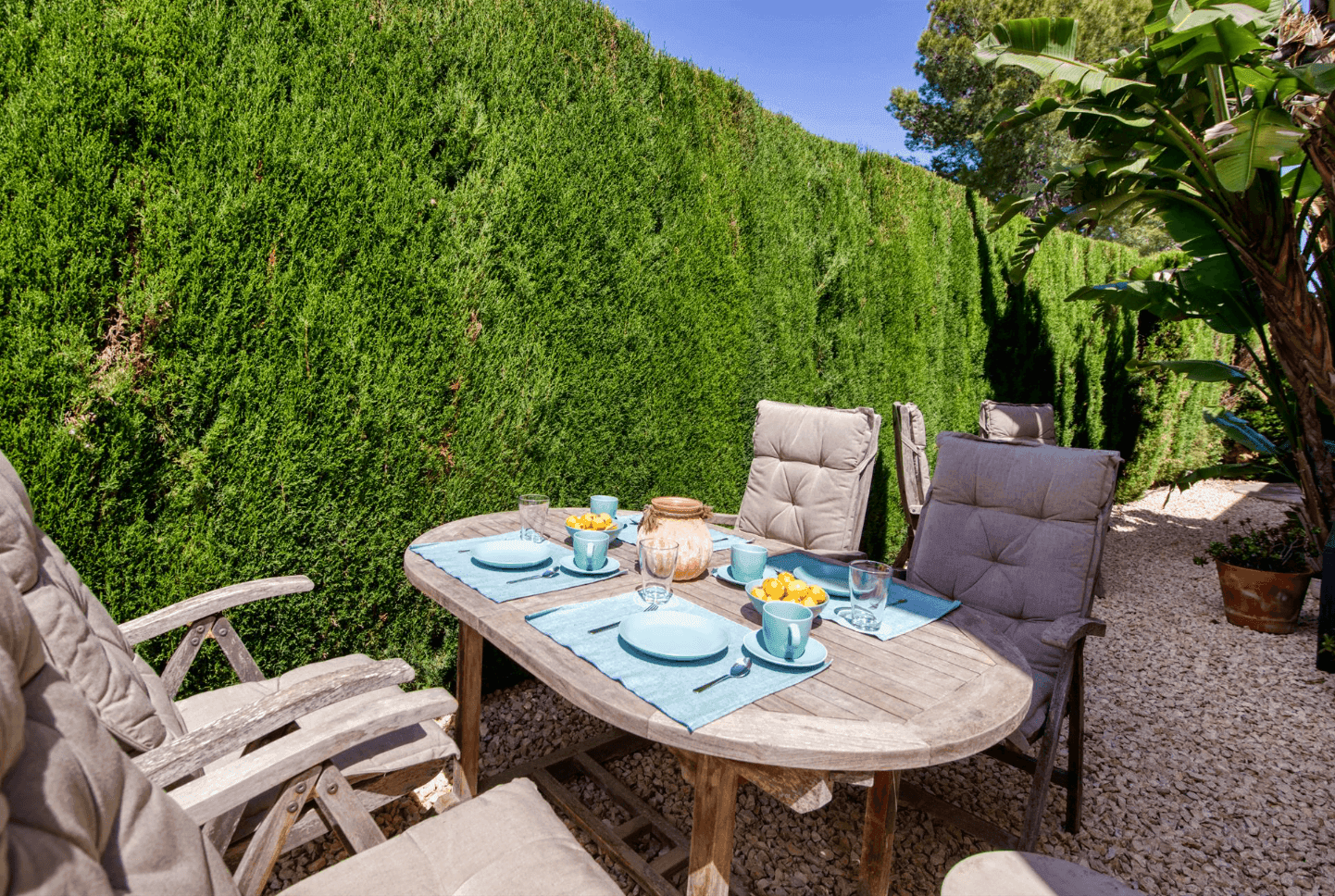 En el exterior de la vivienda encontrarás un conjunto de comedor exterior compuesto por una mesa de madera y cuatro sillas a juego