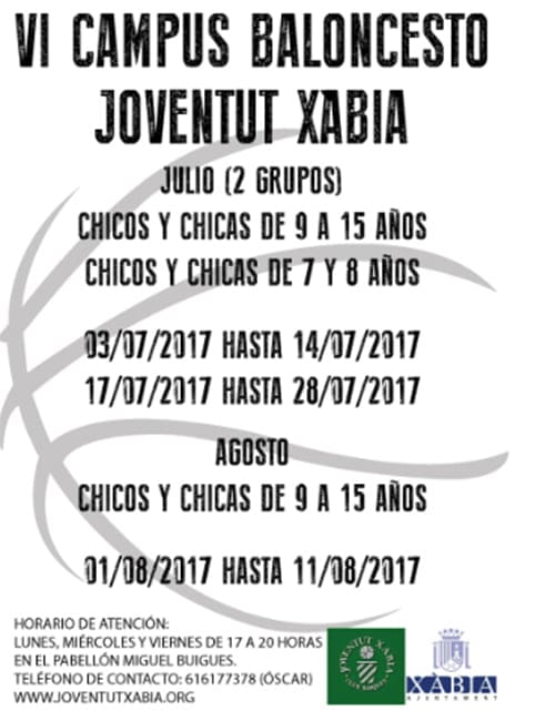 Como cada verano, el CB Joventut Xàbia os trae a todos su actividad estival, su tradicional Campus de verano. Una actividad que se llevará a cabo durante el mes de julio y la primera quincena de Agosto. El objetivo del mismo es intentar que todos los niños y niñas de Xàbia y los muchos veraneantes del municipio, disfruten del baloncesto y otras actividades deportivas, así como excursiones en barco y otras sorpresas que se descubrirán día a día.