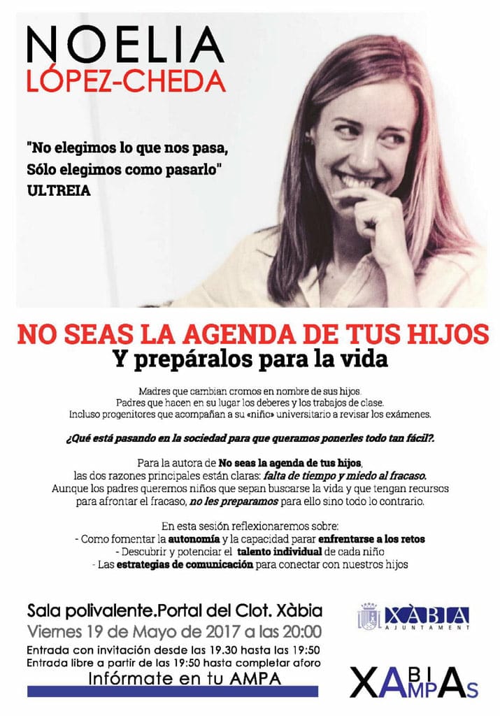 Las AMPAS de los colegios de primaria y los institutos de Xàbia organizan, en colaboración con el Ayuntamiento de Xàbia, la conferencia No seas la agenda de tus hijos y prepáralos para la vida.