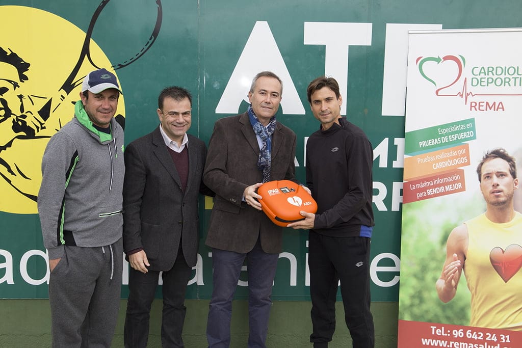 La Academia Tenis Ferrer se dota de un desfibrilador gracias a la aportación de este dispositivo por parte de la Clínica Glorieta y la clínica REMA. Juan Olivert, gerente de la Clínica Glorieta y el Dr. Fernando de la Guía, cardiólogo de la clínica REMA hicieron entrega de este dispositivo automático de reanimación cardio-pulmonar a David y Javier Ferrer.