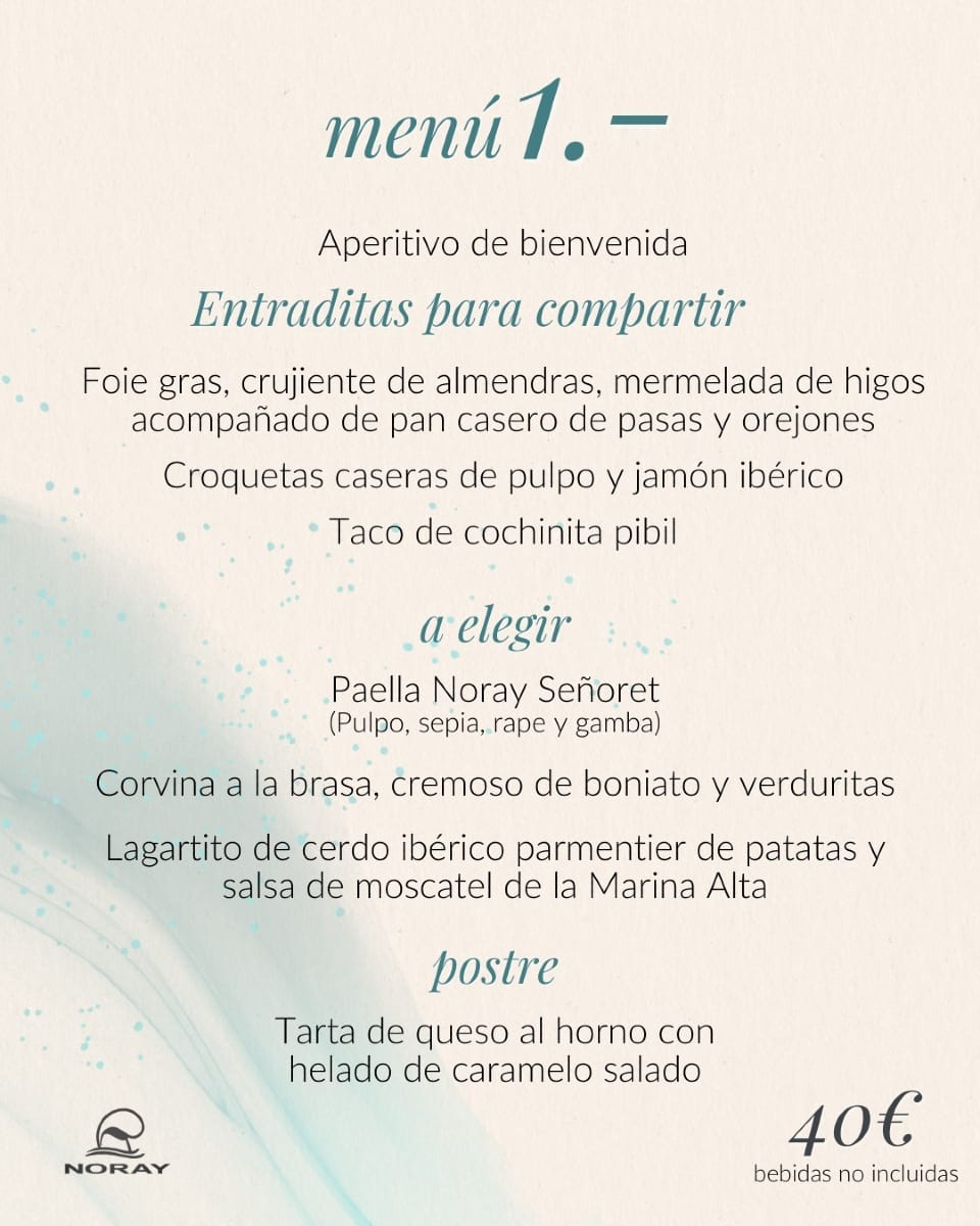 05 de diciembre de 2024 - 11:31Un menú ideal con diversos entrantes y un plato principal Foto Anterior2 de 4Foto SiguienteVer el artículo original: Conoce estos menús llenos de sabores frente al Mediterráneo en Restaurante Noray Una Nochevieja inolvidable con vistas al mar Disfruta compartiendo momentos en Restaurante Noray Un menú especial para grupos para disfrutar en Restaurante Noray Conoce estos menús llenos de sabores frente al Mediterráneo en Restaurante Noray