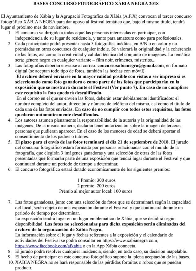 El festival Xàbia Negra celebra, en noviembre de 2018, su tercera edición y como en ediciones anteriores, se realizará el concurso de relatos, cine y fotografía para los aficionados del género Noir.