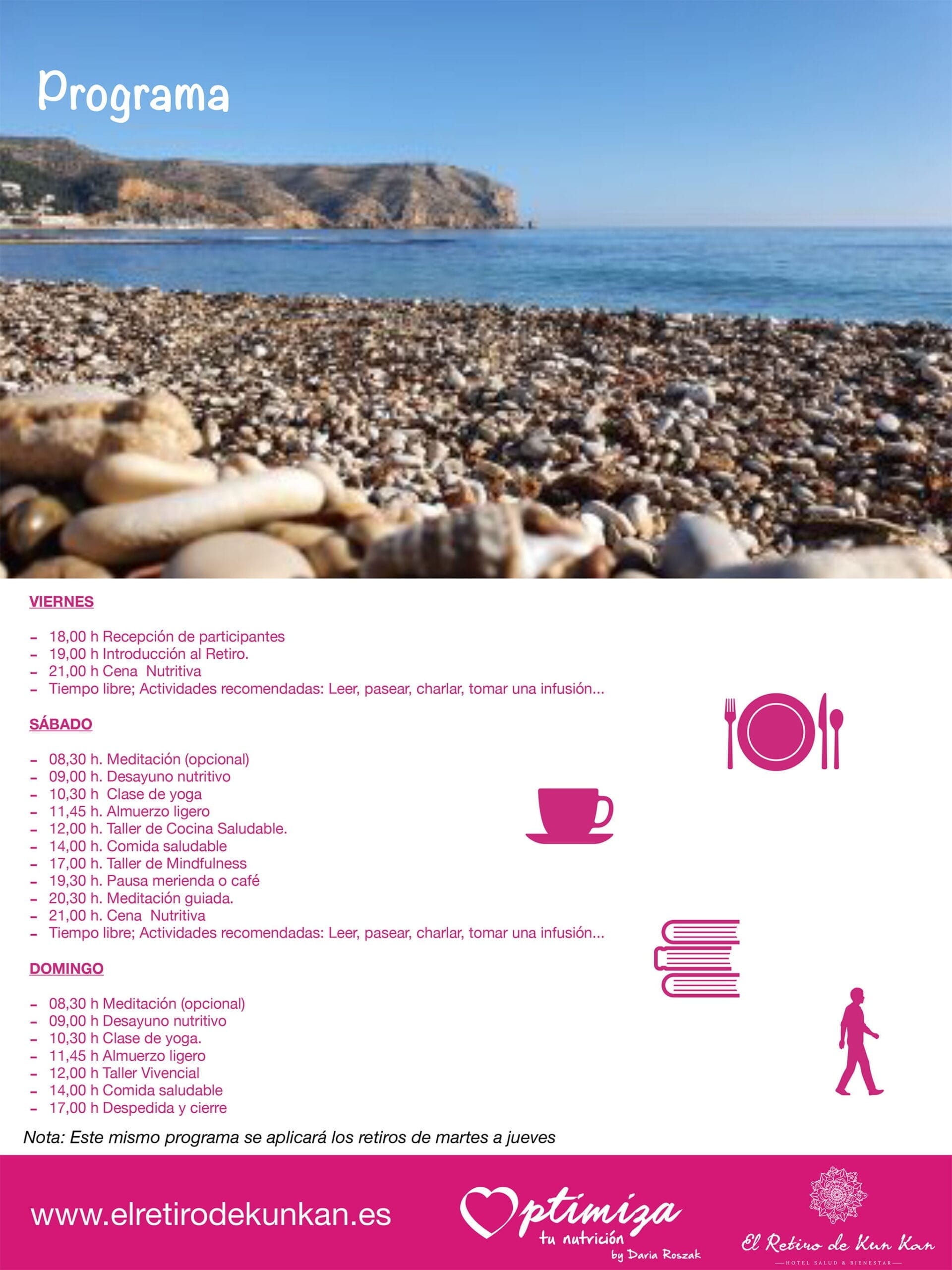 22 de mayo de 2020 - 09:26Actividades repartidas entre viernes y domingo. Foto Anterior6 de 7Foto SiguienteVer el artículo original: Dale un giro a tu vida haciendo un retiro en Jávea con El Retiro de Kun Kan Cartel informativo de retiro de nutrición y mindfulness en Jávea Logotipo de El Retiro de Kun Kan Alojamiento para los asistentes – El Retiro de Kun Kan Condiciones de los retiros de El Retiro de Kun Kan Retiros de nutrición y mindfulness en Jávea – El Retiro de Kun Kan Programa de El Retiro de Kun Kan Cartel anunciador de retiros de nutrición y mindfulness en Jávea
