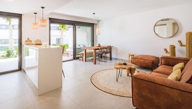 Este moderno apartamento en planta baja es ideal para 4 personas y está decorado con un estilo fresco y funcional. Dispone de dos dormitorios, dos baños, una cocina abierta con barra y un salón con acceso directo a una terraza cubierta decorada con zona lounge. Además, ofrece un pequeño jardín privado con entrada independiente desde el exterior del complejo.