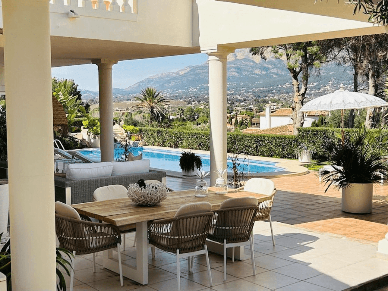 15 de mayo de 2023 - 15:58Podrás disfrutar de unas increíbles vistas a la montaña mientras comes con tu familia o amigos Foto Anterior4 de 16Foto SiguienteVer el artículo original: Descubre Villa California: una joya mediterránea en Jávea disponible para ti Amplia cocina con mucho espacio para almacenaje Baño de la vivienda con amplio plato de ducha y mampara Baño de la vivienda con plato de ducha Disfruta de increíbles vistas durante tus comidas al aire libre Dormitorio de la vivineda con mucha luz y cama de matrimonio Dormitorio doble de estilo rústico – boho con cama doble Fachada de la vivienda con piscina Plato de ducha con mampara de cristal con zona de vestidor Relájate al sol junto a la piscina Salón de la vivienda con chimenea Sillones y mesa auxiliar en el dormitorio principal Terraza cubierta con conjunto chill out Zona de barbacoa exterior en el jardín de la vivienda Zona de comedor con vistas al jardín Zona de comedor exterior en la terraza de la villa Villa California en venta en Jávea