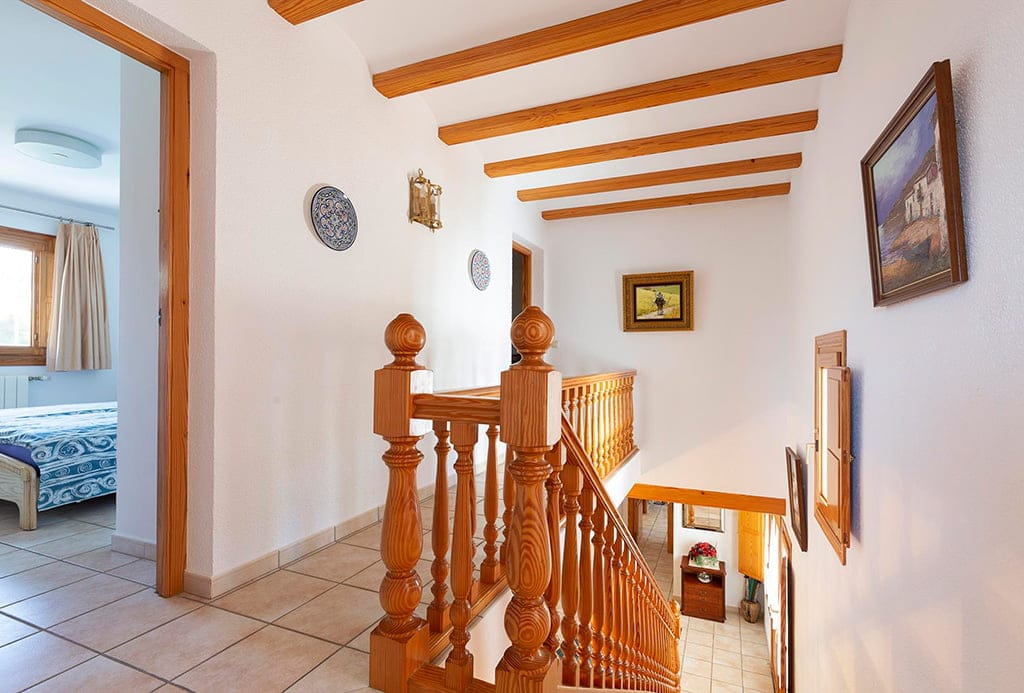 En el exterior de la villa disfrutarás de un bonito jardín con césped, pinos y palmeras y distintos espacios para disfrutar al aire libre, relajarse y dejarse enamorar por las vistas al valle y al Montgó.