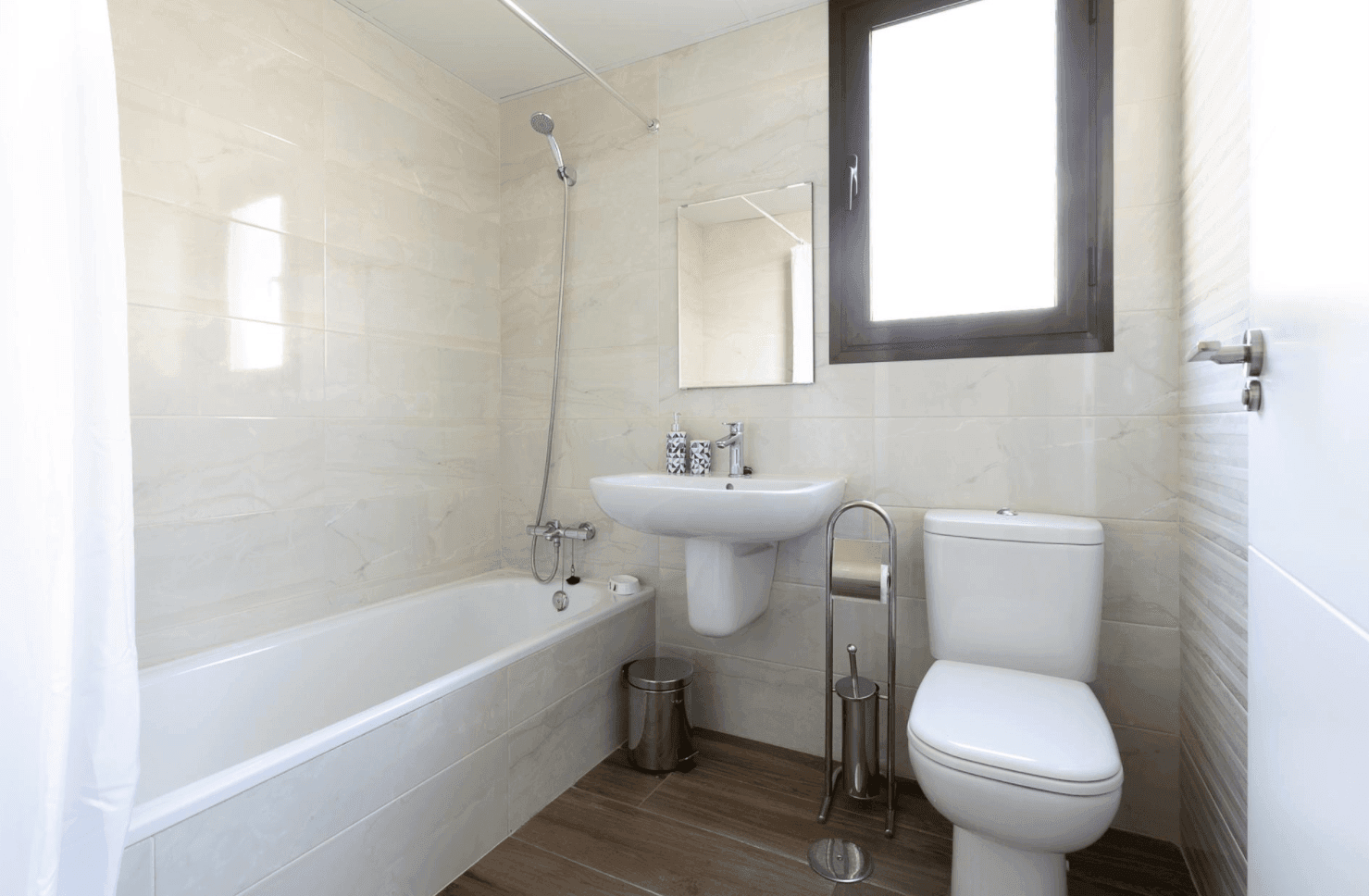 Moderno baño con suelo vinílico, bañera, y ventana abatible