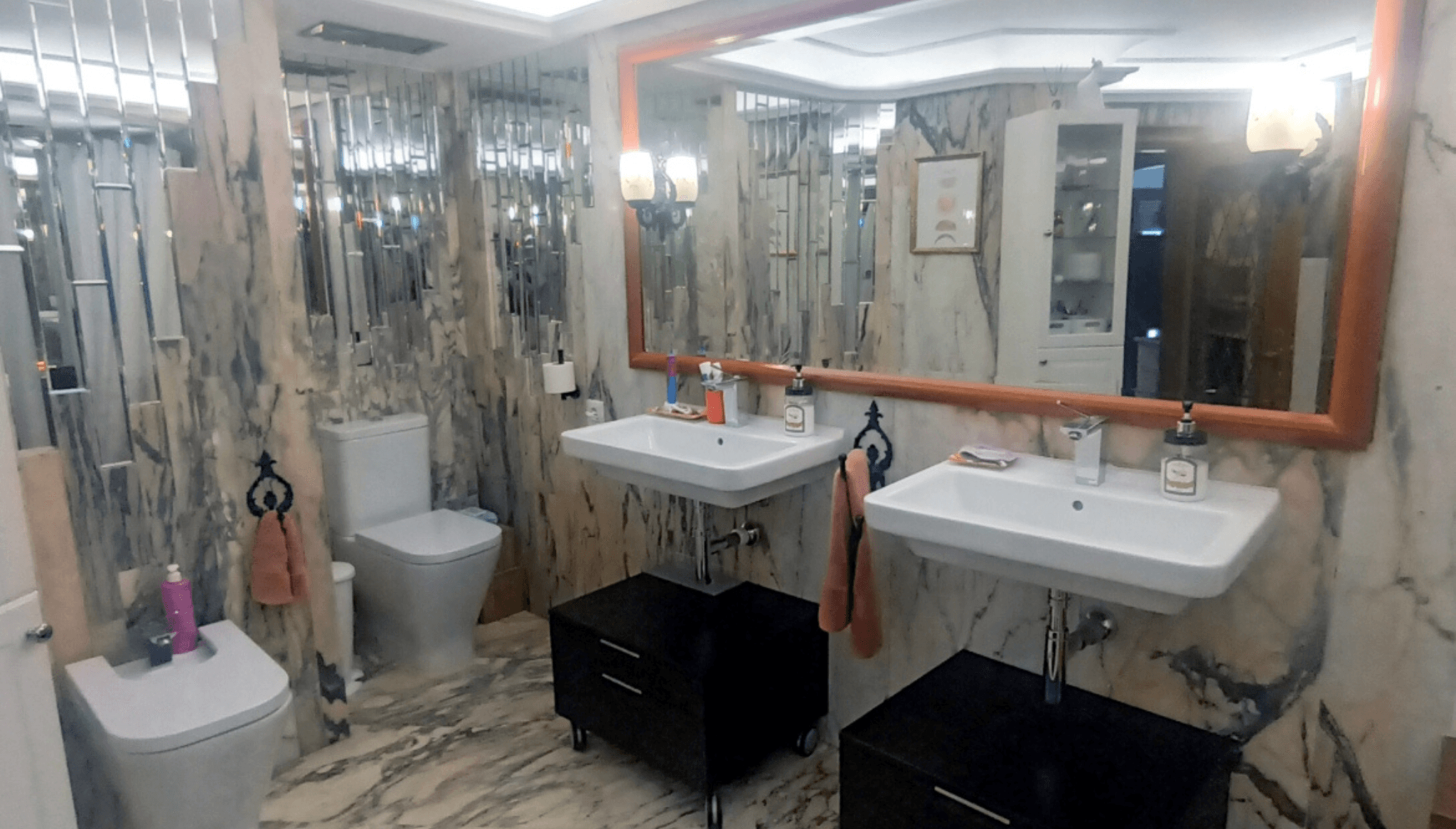 Baño con doble lavabo y ducha espaciosa