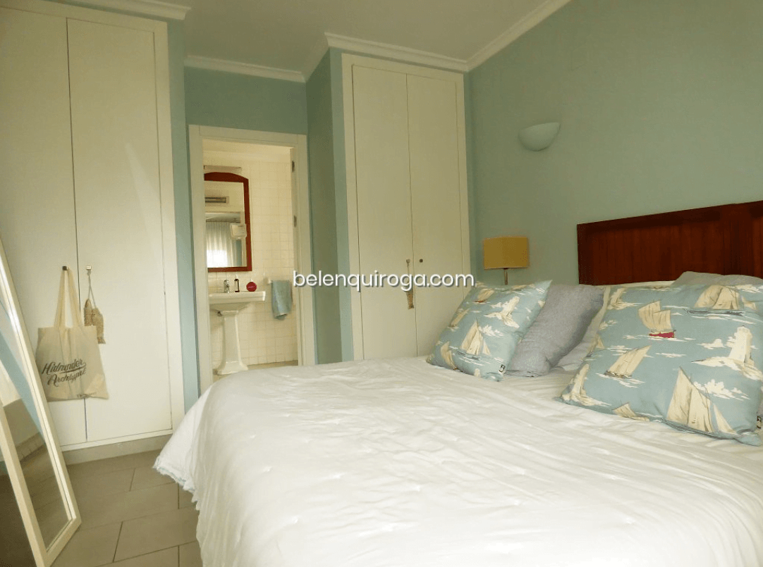 Dormitorio principal con salida a la terraza, dos armarios empotrados ideales para almacenaje y baño en suite con bañera. Su decoración en tonos turquesa, van acordes a la decoración marítima del resto de la casa.