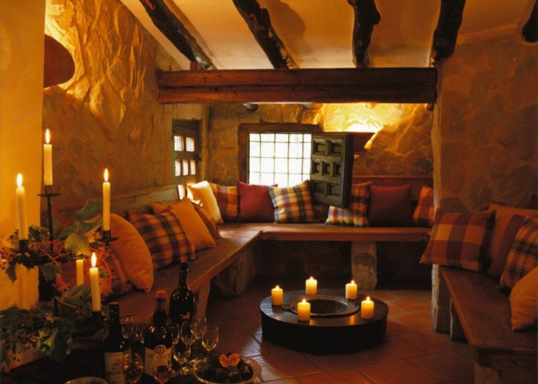Zona de salón con bancos de madera y cojines. La s paredes son de piedra y las bigas de madera, dando al espacio un aspecto rústico