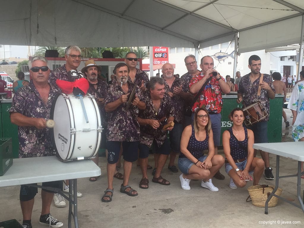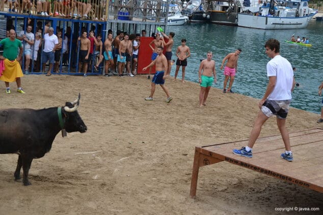 Desde primera hora, vecinos y turistas disfrutaban del buen ambiente que se crea en el recinto taurino con la animación musical de los miembros de la Penya La Bufa y Els Golossos. El palco taurino se llenaba de gente que quería ver de cerca a los toros y el juego de los toreros con el animal para hacer que caiga al agua.
