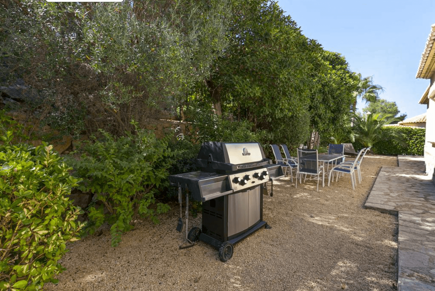 Barbacoa en la zona exterior, con un conjunto de comedor compuesto por mesa de exterior rectangular con ocho sillas a juego