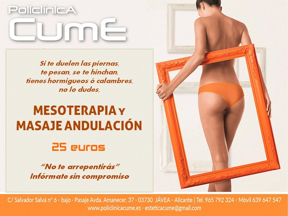Es por este motivo, que en Policlínica CUME han diseñado la mejor oferta para tus sesiones de Mesoterapia y Masaje andulación. Por tan solo 25€, cuida tu piernas y dales un respiro.