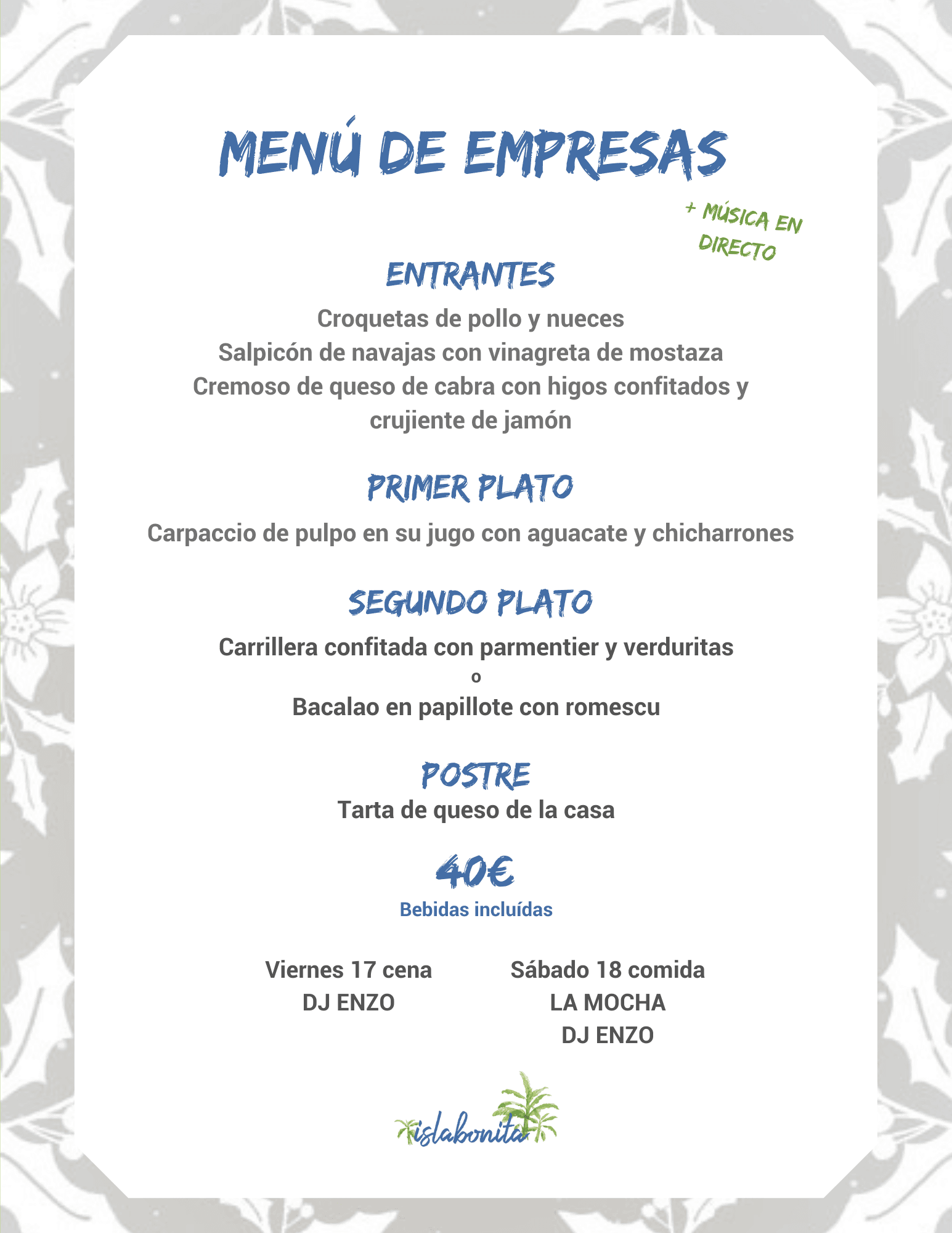 18 de noviembre de 2021 - 11:31Completo menú de empresas por 40€ en Isla Bonita 1 de 1Ver el artículo original: Fantástico menú para empresas con música en directo en Isla Bonita Menú de empresas en Restaurante Isla Bonita