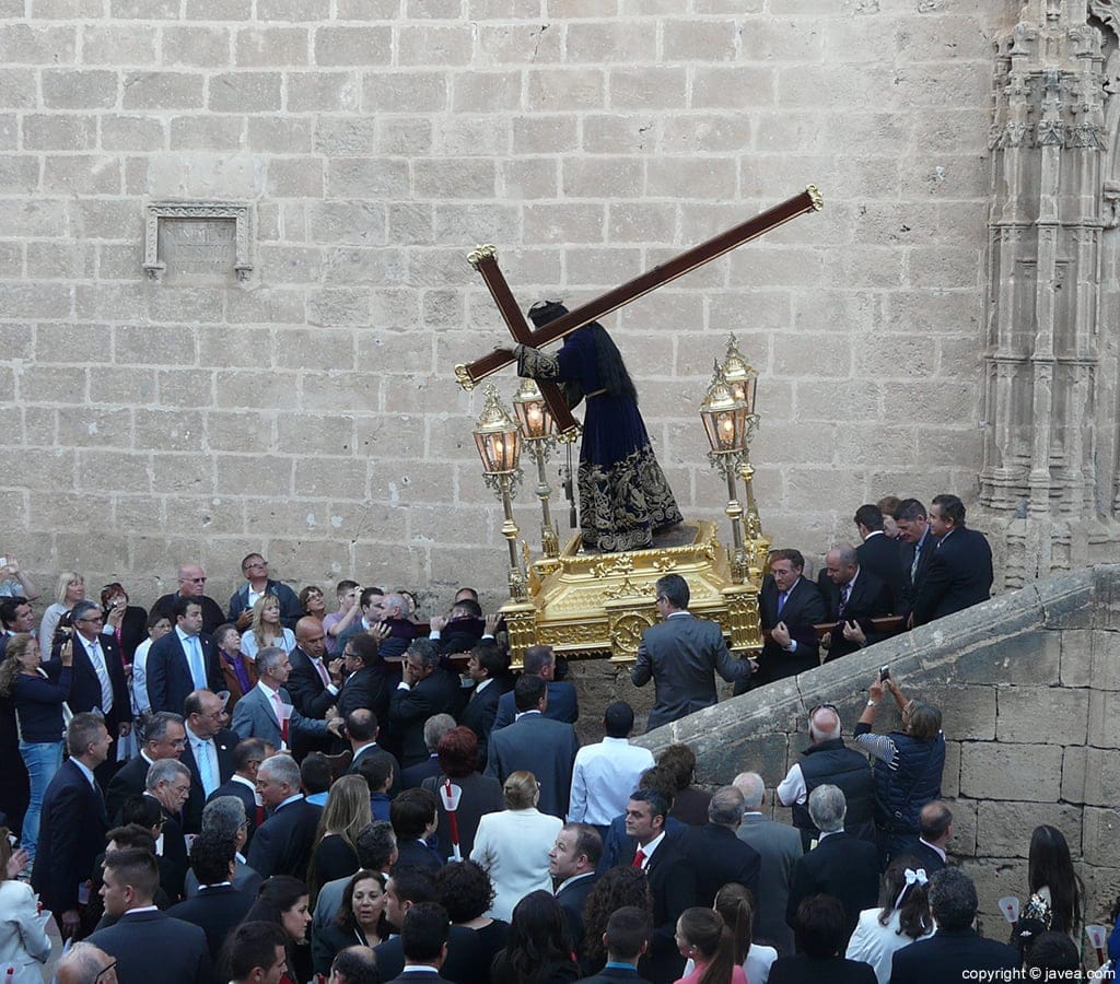 La imagen de Jesús Nazareno en su salida de la Iglesia de San Bartolomé para su subida a la ermita del Calvario.
