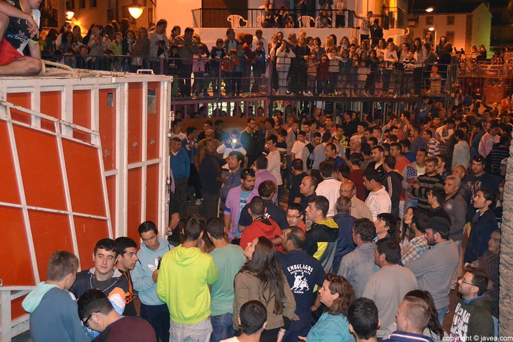 Gente en el ruedo esperando que bajara el toro del camión para poder embolarlo.