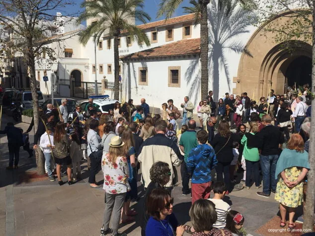 Un gran número de vecinos y vecinas de Xàbia se dieron cita en la Placeta del Convent para celebrar el Domingo de Ramos. Desde las 11:15 horas, era una llegada continua de personas al Convento de las Agustinas, donde el párroco, a partir de las 11:30 horas, en un breve acto, bendecía las palmas y ramos de todos los feligreses.