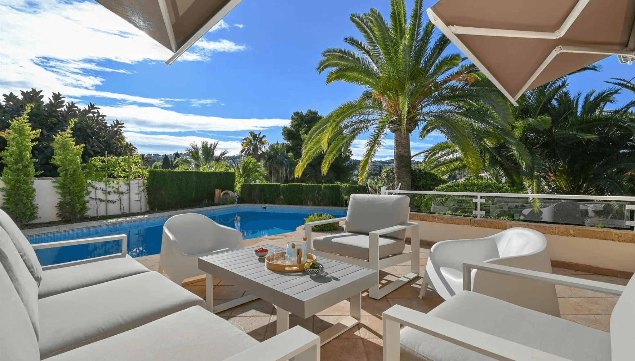 La terraza exterior de Villa Lomas Verdes es perfecta para relajarse, con muebles de jardín y tumbonas. Con vistas al jardín y a la piscina, podrás leer, charlar o tomar una copa en un ambiente tranquilo y agradable.