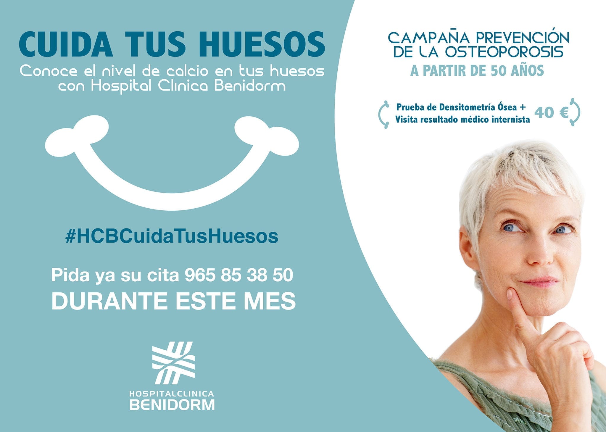 03 de diciembre de 2020 - 14:54Con el nombre «Cuida tus huesos». 1 de 3Foto SiguienteVer el artículo original: “HCB cuida tus huesos”, la campaña de Hospital Clínica Benidorm (HCB) para la prevención de la osteoporosis Campaña para la prevención de la osteoporosis – Hospital Clínica Benidorm (HCB) Logotipo de Hospital Clínica Benidorm «Cuida tus huesos» – Hospital Clínica Benidorm (HCB)