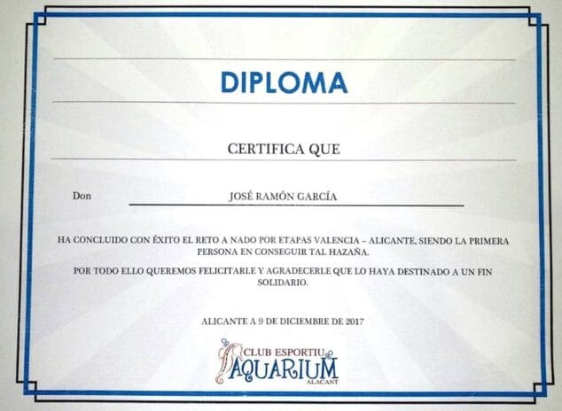 El día 9 de diciembre de 2017 queda grabado en la memoria de los nadadores xabieros, José Ramón García y Colin Smithson como uno de los más importantes de sus vidas. Después de 11 meses, más de 200 km a nado y 70 horas en el mar, ambos han conseguido el reto solidario por el que nadaban y con el que se han convertido en los primeros nadadores del mundo en nadar desde el espigón del puerto de Valencia, en la playa Pinedo hasta el espigón del puerto de Alicante, playa del Postiguet por etapas.