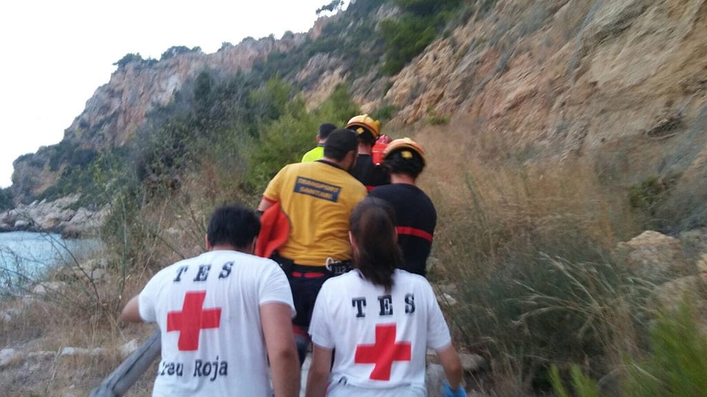 Una vez descartada la evacuación por mar, los equipos de emergencias tuvieron que estabilizar inicialmente al paciente e inmovilizarle para subirle a pulso con una camilla hasta arriba, donde una unidad SAMU procedió a su asistencia así como traslado al Hospital de Dénia.