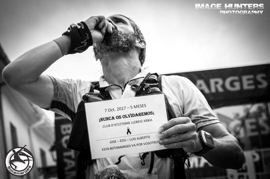 El atleta, Juanjo Vallés, perteneciente al Club Atletismo Llebeig Xàbia tuvo un gesto que no paso desapercibido para el público que estaba presente en la línea de meta de la IX Botamarges Trail, celebrada en Forna. Vallés, bajo el arco de llegada, sacó una pequeña pancarta donde se pudo leer «7 de octubre 2017, cinco meses después NO OS OLVIDAREMOS. Club Atletismo Llebeig Xàbia. José, Edu y Luis Alberto. Esta Botamarges va por vosotros”. Todo esto con una mirada al cielo y lanzando un beso para los tres.
