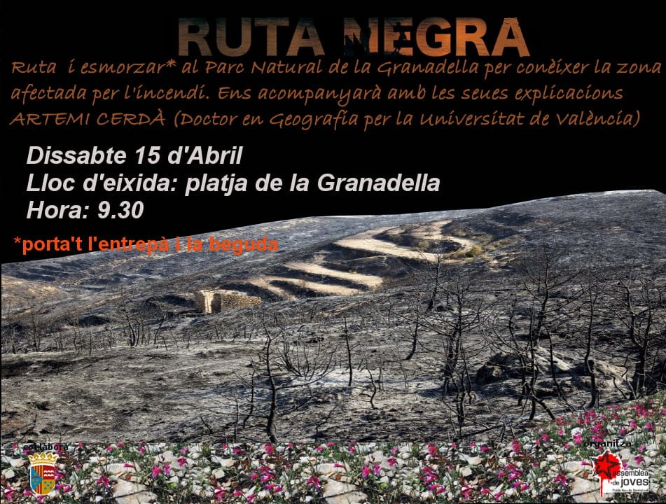 Siete meses después del devastador incendio que arrasó con el paraje de la Granadella, la Asamblea de Jóvenes junto a la colaboración del Ayuntamiento de Benitatxell, han organizado, para el sábado 15 de abril, una ruta para conocer la zona afectada.