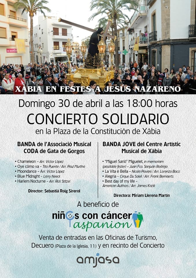 25 de abril de 2023 - 12:09 1 de 2Foto SiguienteVer el artículo original: La Banda Jove del CAM de Xàbia realiza un concierto solidario a favor de Aspanión niñ@s con cáncer Cartel del Concierto Solidario a favor de Aspanión niños con cáncer Concierto Solidario de la Banda Jove