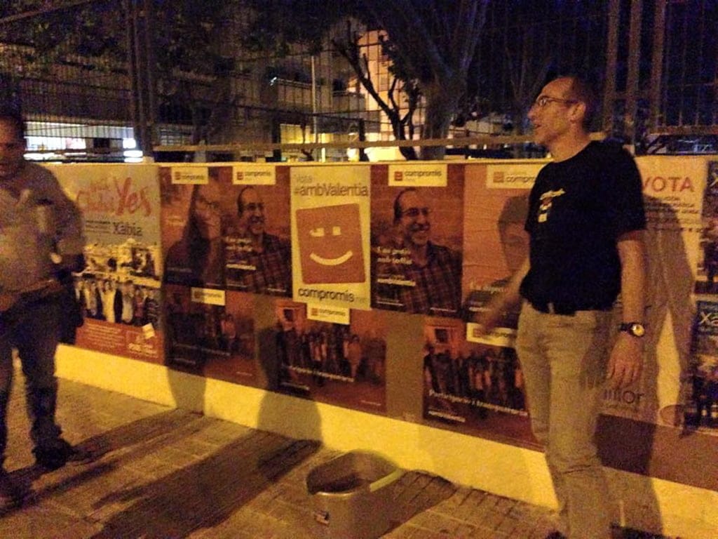 El candidato de Compromis per Xàbia durante la pegada de carteles.