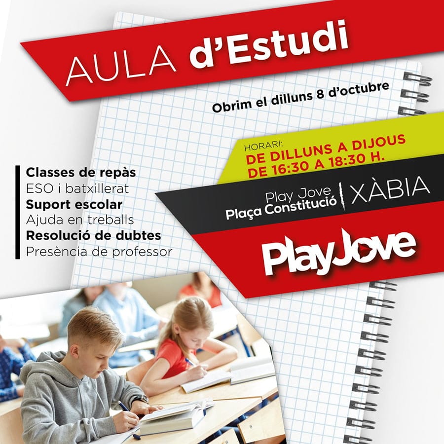 En las instalaciones de PlayJove, en la plaza de la Constitución, a partir del lunes, se podrá en marcha el Aula d’estudi, un servicio que se ofrece desde la concejalía de Juventud de Xàbia. Los estudiantes que cursen bachillerato, ciclos formativos y ESO dispondrán de este servicio de repaso escolar.