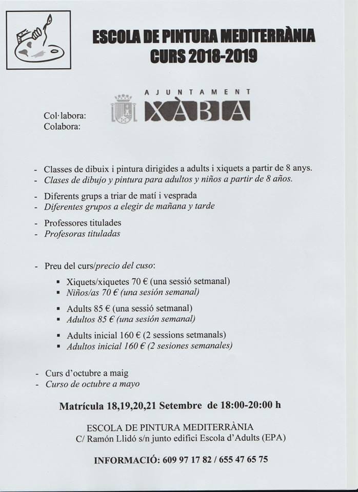 La Escola de Pintura Mediterrània de Xàbia ha anunciado las fechas de matricula para todas aquellas personas que quieran inscribirse en el próximo curso para aprender a dibujar y pintar.