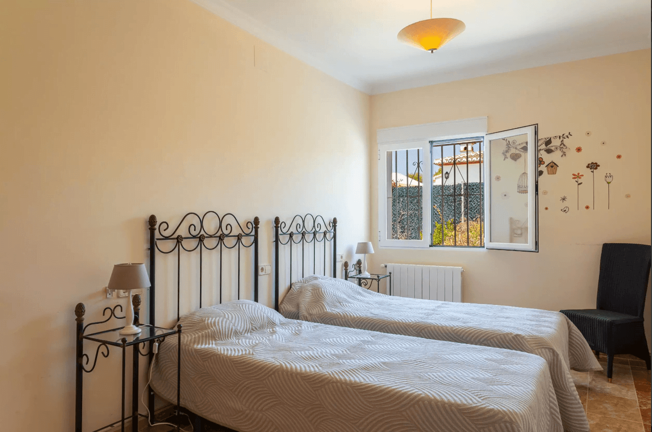 01 de agosto de 2022 - 13:40Dormitorio doble con dos camas individuales y aire acondicionado Foto Anterior3 de 14Foto SiguienteVer el artículo original: La espaciosa y confortable casa en Jávea en la que querrás envejecer Amplia cocina con mesa para comer Dormitorio con cama de matrimonio y armarios empotrados Dormitorio con dos camas individuales Fachada de la vivienda en venta con Vicens Ash Piscina de la vivienda rodeada de vegetación Salón de la vivienda con chimenea Salón de la vivienda de estilo rústico con chimenea Terraza exterior con arcos que dan a la piscina y un pozo Terraza exterior cubierta con zona chill out Zona chill out en la terraza exterior cubierta Zona de barbacoa exterior cubierta con comedor exterior y pérgola Zona de comedor exterior cubierto por una pérgola Zona de piscina con hamacas Zona de comedor con aire acondicionado
