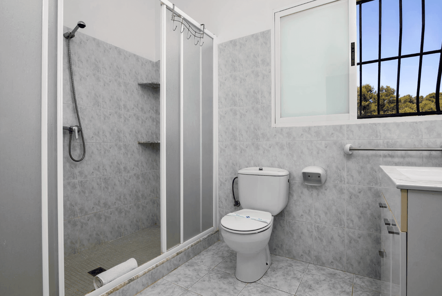 Baño equipado con plato de ducha y mampara de cristal