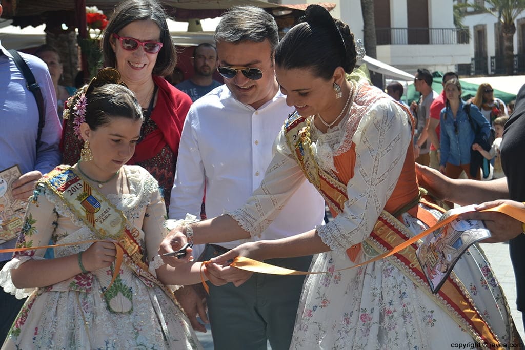Ángela Devesa y Olivia Clemente, representantes de Fogueres 2013, cortando la cinta que inauguraba la Feria de Artesanía de Semana Santa de Jávea.