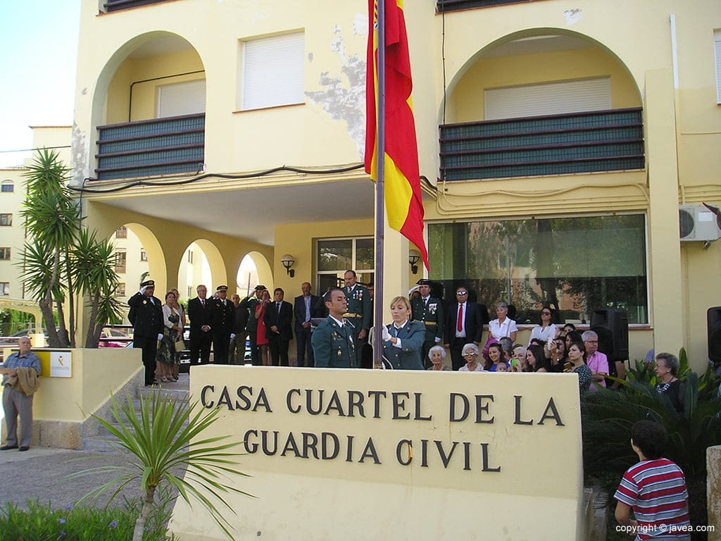 12 de octubre de 2015 - 20:33Momento de izar la bandera de España. Foto Anterior2 de 16Foto SiguienteVer el artículo original: La Guardia Civil de Xàbia celebró la festividad de su patrona la virgen del Pilar Guardias civiles de la Casa Cuartel de Xàbia Izada de la bandera de España Comienzo del actos a los caídos Acto previo a la izada de bandera Autoridades civiles y militares en la misa Dos guardias civiles con la corona Desfile de la G. Civil Disparo de las salves de honor Sacerdotes celebrando la misa Cargando armas Representación municipal Bandera de España en el mastil Formación de la Guardia Civil Momento de la Misa de Campaña Ofrenda de la corona a los caídos Público asistente a la misa