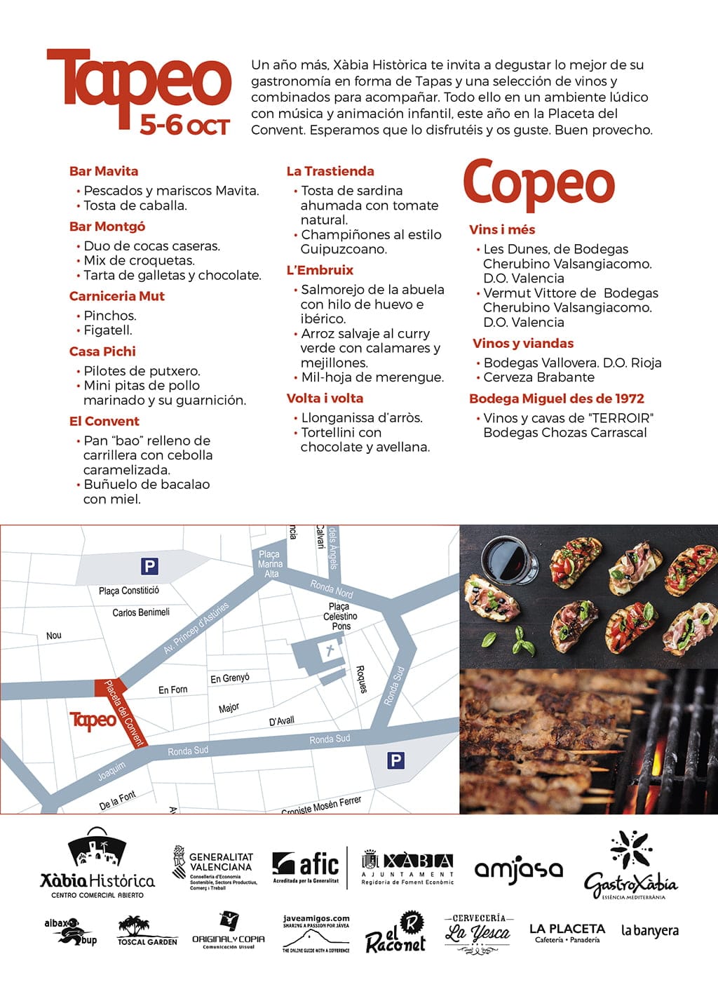 Una nueva edición del Tapeo vuelve a Xàbia Histórica. Con cambio de escenario y una gran variedad de suculentas tapas, la Asociación de comerciantes de Xàbia Histórica ha preparado una jornada repleta de actividades que se acompañará con los buenos productos de la zona.