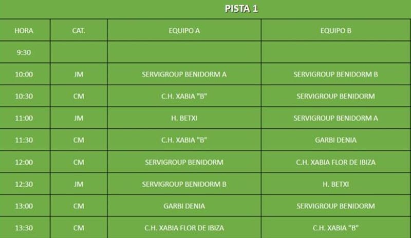 En el campo 1, estarán los equipos Juveniles y Cadetes chicos. En la categoría Juvenil serán 3, los equipos que participan: Servigroup Benidorm A, Servigroup Benidorm B y H Betxi. Mientras que en la categoría Cadete, el número es de cuatro; CH Xàbia B, Garbi Dénia, Servigroup Benidorm, CH Flor Ibiza Xàbia,