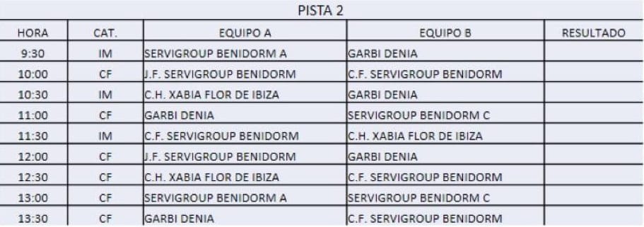 En el campo 2 se disputarán los encuentros de las categorías cadetes chicas e infantil chicos. La competición de cadetes chicas la forman 6 equipos; Garbi Dénia, Servigroup Benidorm A, Servigroup Benidorm B, Servigroup Benidom C.CH Flor Ibiza Xàbia. En la categoría de infantil masculino serán 3 las formaciones que luchen por el triunfo final; CH Flor Ibiza Xàbia, Garbi Dénia y Servigroup Benidorm,